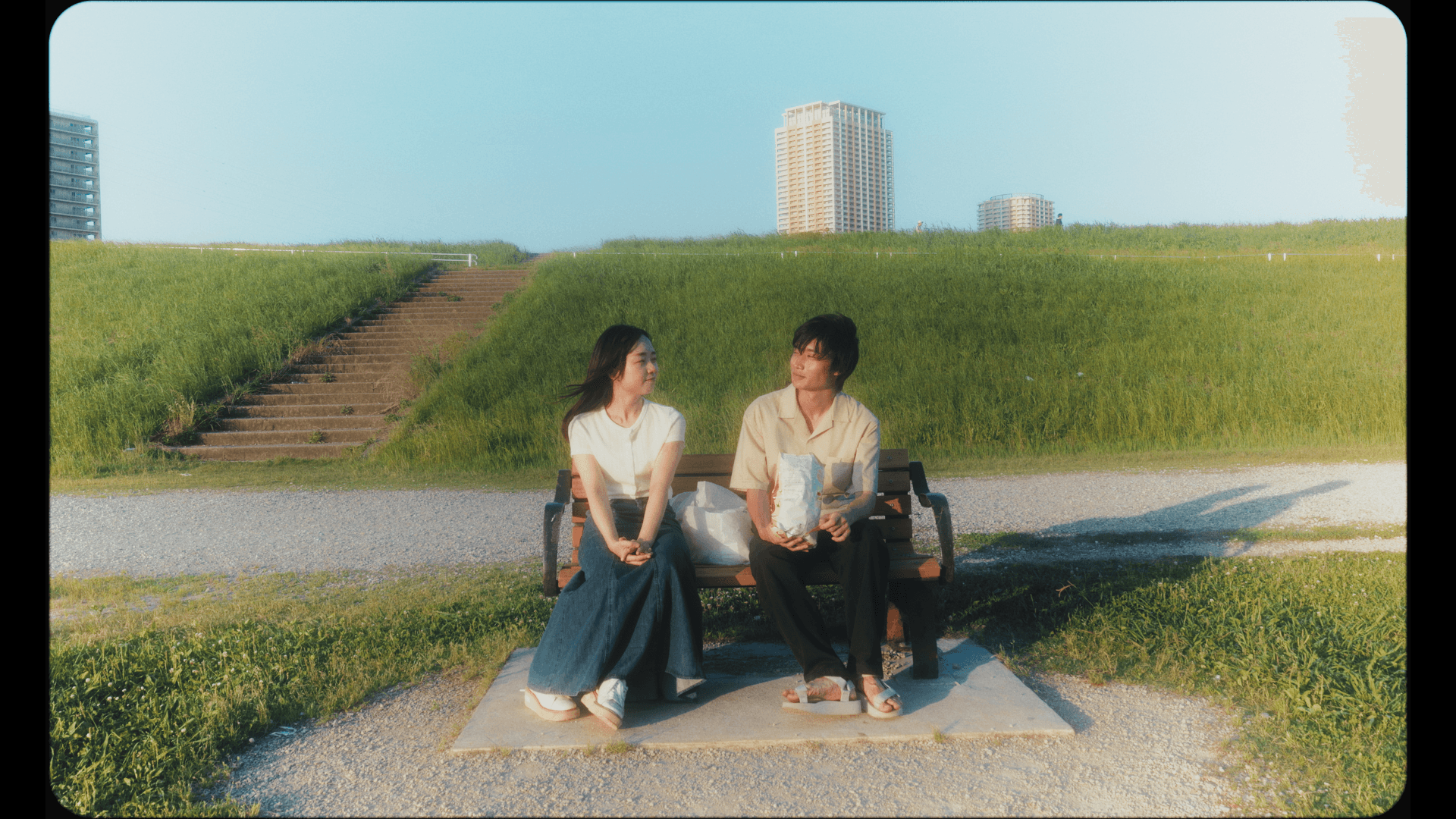 A story about two people talking about a cat at the bench.